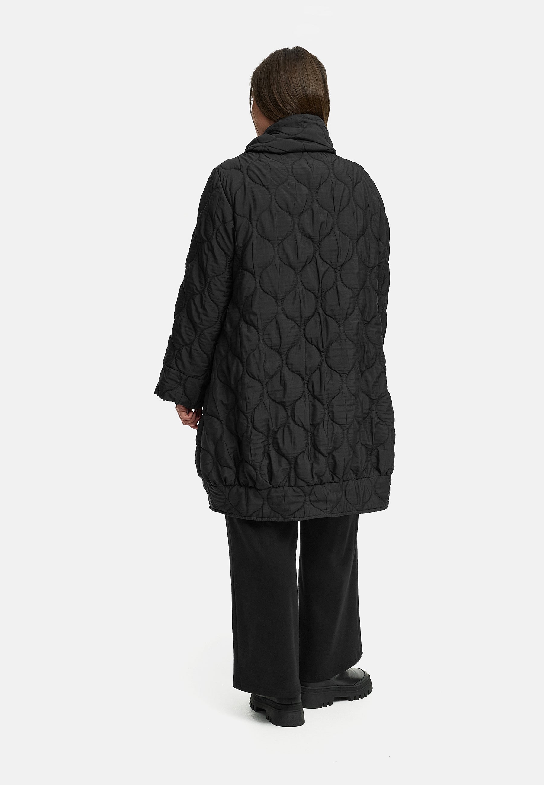 Der Mantel „Ysmara“ bringt Struktur in die kalte Jahreszeit. Die ovale Steppung verleiht ihm eine einzigartige, plastische Oberfläche, die Wärme mit Stil verbindet. Sein großzügiger Kragen rahmt das Gesicht elegant ein und lässt sich für verschiedene Looks individuell stylen – ob lässig geöffnet oder schützend hochgestellt.